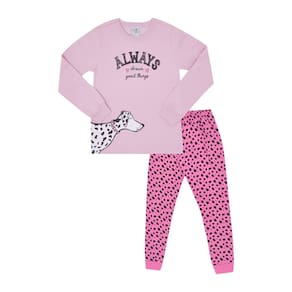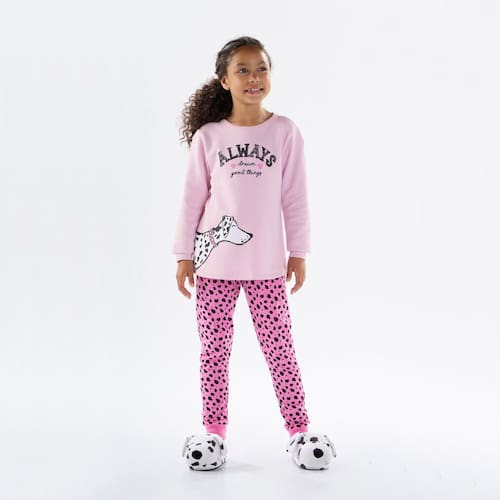 Os pijamas estão cada vez mais divertidos e cheios de estilo para uma boa noite de sono! Invista neste conjunto que é a cara da estação, a blusa de manga longa na cor lavanda possuí estampa de dálmata na lateral e escrita frontal "Sempre sonhe coisas boas" . A calça com estampa rotativa de manchas de dálmata possuí elastano no cós. Ambas as peças são confeccionadas em moletinho garantindo conforto durante a noite toda!\n