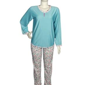 Pijama feminino com blusa em malha lisa, decote redondo com acabamento em malha estampada e 3 botoes. Calça em malha estampada longa, com elástico no cós.