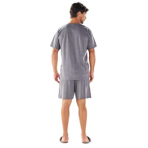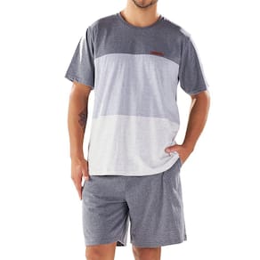 Pijama masculino fabricado pela Pzama com meia maga e bermuda em meia malha. Camisa com gola redonda e faixas horizontais em degradê na parte frontal com costas lisas. Bermuda mais longa com elástico embutido e bolsos laterais. Modelo homewear confortável para o dia a dia e fácil de lavar e secar.