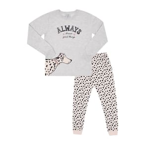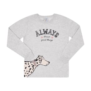 Os pijamas estão cada vez mais divertidos e cheios de estilo para uma boa noite de sono! Invista neste conjunto que é a cara da estação, a blusa de manga longa na cor mescla banana possuí estampa de dálmata na lateral e escrita frontal "Sempre sonhe coisas boas" . A calça com estampa rotativa de manchas de dálmata possuí elastano no cós. Ambas as peças são confeccionadas em moletinho garantindo conforto durante a noite toda!\n