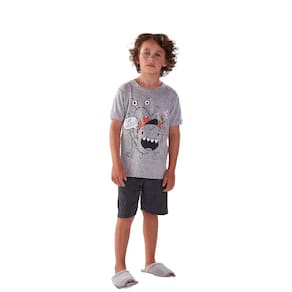 A Good Night by Pulla Bulla traz um conjuntinho super animado para as noites do seu menininho. Uma Camiseta confeccionada em meia malha na cor Mescla cinza com estampa de monstrinhos e uma Bermuda confeccionada em meia malha na cor Mescla preto, um look perfeito para alegrar ainda mais as noites de seu pequenino.\n