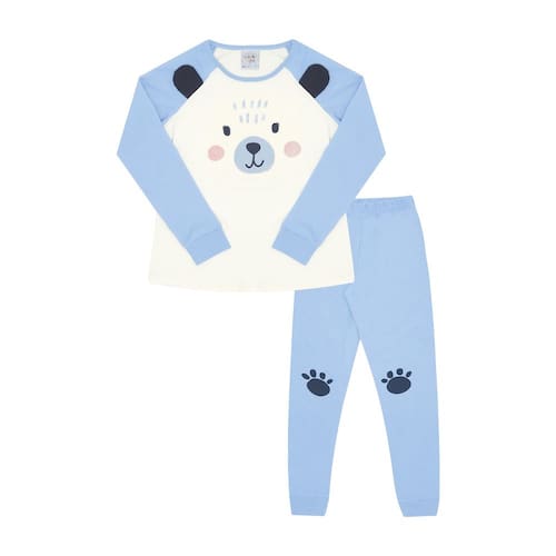 Nosso conjunto de pijama é composto pela blusa e a calça em tecidos meia malha na cor off white com hortênsia. A blusa de manga longa possuí estampa frontal de ursinho com orelhas interativas e a calça com elastano na cintura também possuí estampa de patinhas de urso no joelho. Assim a hora do soninho se torna mais leve, quentinha e alegre!\n