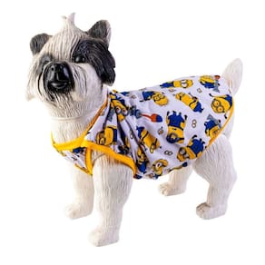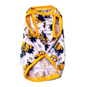 Pijama para cachorro estampa minions - tamanho EG - pijama confeccionada em malha pv poliéster com viscose na cor branca; - estampa temática do personagem minions; - acabamento em cotton preto; Medidas aproximadas: - TAMANHO EG Pescoço: 40 cm de circunferência Abdômen / torax: 58 cm de circunferência Comprimento: 56 cm Além de muito confortável e lindo, deixará seu pet ainda mais charmoso. Marca: Não Informado
