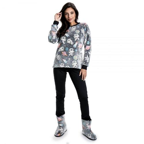 Este pijama de pelúcia é a escolha perfeita para as noites frias e aconchegantes. Com o modal peluciado quentinho, ele oferece uma sensação suave ao toque e mantém seu corpo aquecido. Além disso, ele tem um detalhe especial que brilha no escuro, tornando-o ainda mais divertido e único. Com uma estampa delicada e contemporânea, este pijama é uma excelente opção para quem busca conforto e estilo. Com mangas longas e calças compridas, é perfeito para quem gosta de se enrolar nas cobertas para dormir. É um item indispensável para qualquer pessoa que valoriza uma boa noite de sono.