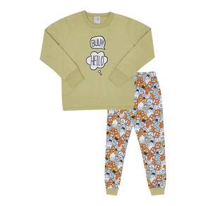 Quentinho e divertido para aquecer os pequenos durante a estação. Confeccionado em moletinho, o blusão de manga longa na cor pistache possuí estampa frontal com escrita "buu!" "Hello" e ambas brilham no escuro também. Já a calça possuí estampa rotativa na cor pistache de pequenos fantasmas e seres divertidos além de possuir elastano no cós. Tudo para garantir uma boa noite de sono aos pequenos aventureiros!\n