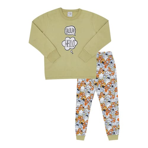 Quentinho e divertido para aquecer os pequenos durante a estação. Confeccionado em moletinho, o blusão de manga longa na cor pistache possuí estampa frontal com escrita "buu!" "Hello" e ambas brilham no escuro também. Já a calça possuí estampa rotativa na cor pistache de pequenos fantasmas e seres divertidos além de possuir elastano no cós. Tudo para garantir uma boa noite de sono aos pequenos aventureiros!\n