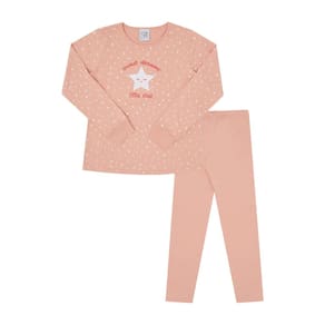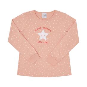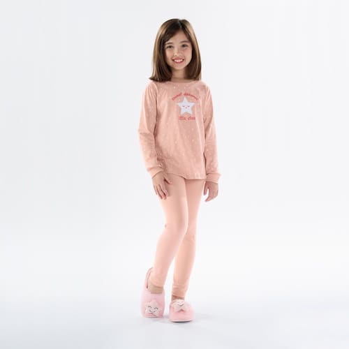 Os pijamas estão cada vez mais estilosos e confortáveis para as meninas! O conjunto na cor rotativo melissa é confeccionado em meia malha e cotton leve e possuí a blusa de manga longa com estampa frontal de estrela e escrita "Doces sonhos/Pequena estrela". A calça além de super quentinha, possuí elastano no cós para maior conforto durante a noite. \n