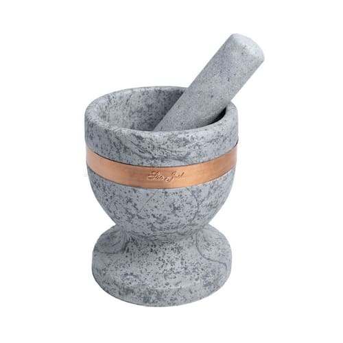 Pilão em pedra sabão com detalhes em cobre, ideal para preparar temperos, ervas, alho, pimentas e especiarias. A pedra sabão é resistente, não retém cheiro e ajuda a triturar ingredientes com facilidade, preservando aroma e textura. O cobre traz acabamento elegante e reforça a durabilidade. Visual rústico sofisticado. Perfeito para culinária artesanal.Bica móvel