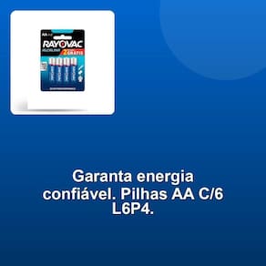 Pilha Alcalina Aa C/6 L6p4 Desfrute de total liberdade em suas atividades tecnológicas com as Pilhas Alcalinas AA Com 6 L6p4 - 20871. Especificamente projetadas para aparelhos com alto consumo de energia, essas pilhas permitem que você realize suas tarefas sem preocupações com a duração da bateria. Além disso, as Pilhas Alcalinas Rayovac são conhecidas por sua confiabilidade e performance. Com isso, você pode ter certeza de que seus dispositivos estarão sempre prontos para uso. Além disso, essas pilhas são projetadas para fornecer uma potência constante, mesmo quando você precisa de mais energia.