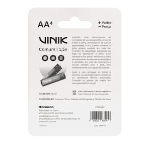 PILHA COMUM AA C/4 1.5V - VP2AB4C As pilhas e baterias Vinik são a escolha perfeita para diversas situações, oferecendo desempenho confiável e durabilidade para todos os tipos de dispositivos. Seja para controles remotos, videogames, lanternas, sensores, brinquedos ou muitos outros aparelhos, nossas pilhas garantem energia quando você mais precisa. Disponíveis em uma ampla variedade de tipos e tamanhos, projetadas para atender às suas necessidades com eficiência e qualidade. Mais potência por menos preço. Características Tipo: Comum Tamanho: AA Voltagem: 1,5V Blister: 4 unidades