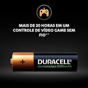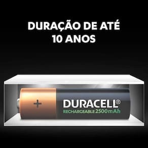 Ideais para controles de vídeo game, brinquedos, câmeras digitais e muitos outros aparelhos, as pilhas recarregáveis Duracell AA 2500 mAh podem ser recarregadas centenas de vezes em qualquer carregador NiMH. Além de serem pré-carregadas na fabricação, o que possibilita o uso imediato, elas permanecem carregadas por até 12 meses quando não estão em uso e têm duração de até 10 anos.