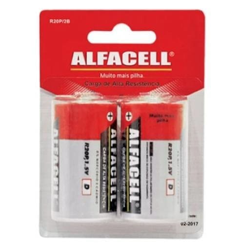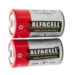 As pilhas Alfacell do tipo D com a voltagem de 1,5V são ideais para lanternas, brinquedos, entre outros eletrônicos. Elas vêm em uma embalagem economia com duas unidades
