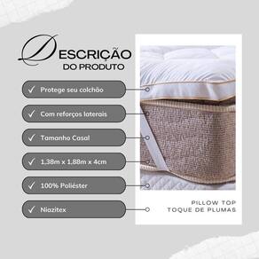 O Pillow Top Niazitex vai deixar as suas noites mais aconchegantes. Confeccionado em 100% poliéster, com enchimento em poliéster siliconizado, o Pillow Top Toque de Plumas funciona como um travesseiro sobre o colchão. Conta com reforços nas laterais como um suporte adicional na hora de arrumar a cama. Possui toque macio e leva mais durabilidade ao colchão, protegendo-o do suor e de manchas.