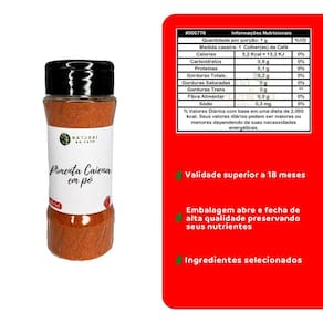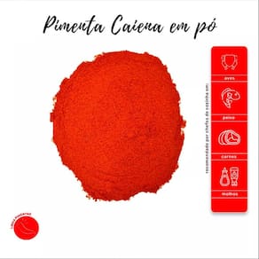 Pimenta Caiena em Pó - Embalagem: 50g - Ingredientes: Pimenta caiena e corante natural de urucum. - Informações: A pimenta caiena ou pimenta cayena é uma variedade de capsicum annum, uma espécie de planta nativa da América. O nome caiena deriva da cidade de origem, Cayenne, capital da Guiana Francesa, daí a versão do nome pimenta cayena. É um condimento de cor alaranjada ou avermelhada e bem saboroso. Quando comparado a outros tipos de pimenta, a caiena apresenta um ardor mais intenso. A ardência e a sensação de calor da pimenta são atribuídas ao alto teor de capsaicina, um composto que levou a pimenta a ser Utilizado na medicina tradicional e que atualmente é apontado como aliado da boa forma e saúde pelos famosos. A pimenta caiena contém vitaminas A/B1/B2/B6/C/E/K, betacaroteno, criptoxantina, colina, luteína, zeaxantina, folato, manganês, potássio, cobre, ferro, magnésio, selênio, fósforo e zinco. - Como consumir: Pode ser utilizada para temperar carnes, aves, peixes, molhos ou como preferir. - Modo de armazenamento: Armazene em um local fresco, seco e arejado, abrigado de fontes de calor e luz direta. Após abertos, devem ser consumidos até a data de validade indicada na embalagem. - Alérgenos: Não contém glúten. Pode conter derivados de soja.