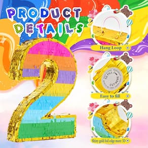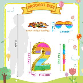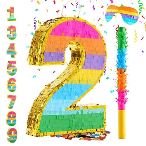 Pinata com número multicor, 1-9 - Decorações de aniversário perfeitas: decore a festa de aniversário de suas meninas ou meninos com esta piñata número 2 de cor brilhante que combina com bordas de folha dourada brilhante mais 3D. É uma maneira divertida e única de interagir com convidados em uma festa. As crianças ficarão encantadas em ver esta pinhata visualmente atraente em sua festa de aniversário. - Fácil de usar e preencher: A pinhata de aniversário mede 42 x 29 x 7,6 cm com um orifício pré-fabricado e um laço de pendurar resistente na parte superior para pendurar facilmente em qualquer lugar. Basta cortar uma abertura na parte superior para preencher com doces variados, chocolates, confetes e lembrancinhas para crianças (o pacote inclui apenas confetes) - Material premium: a piñata infantil é feita de papel ondulado grosso. Design de superfície multicolorida e linda borda de folha dourada, elegante e durável. Embalagem resistente sem se preocupar em apertar. Todos terão a chance de acertar e criar lindas memórias! - Várias cenas: Pequena pinhata de aniversário ideal para pendurar em uma árvore, grade ou telhado como uma excelente sessão interativa, e aproveite a diversão tradicional juntos. Também pode ser exibido em mesas de jantar ou sobremesa como uma peça central atraente. - Pacote completo: inclui 1 pinata número 2 arco-íris, 1 palito, 1 venda e confetes de 30 g que podem ser preenchidos dentro da sua piñata. Adiciona um toque vibrante ao seu aniversário ou festa temática de festa. Peça nossa piñata número 2 com confiança e ofereça uma garantia vitalícia!