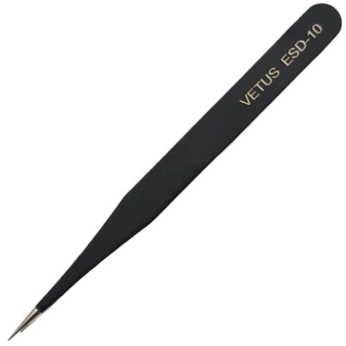 A pinça anti estática Vetus ESD-10 é uma ferramenta de precisão projetada para manipular componentes eletrônicos sensíveis, como chips, resistores e capacitores. Com um comprimento de 110mm, possui uma ponta reta que permite um manuseio preciso e seguro.