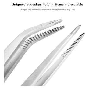 Com um comprimento de aproximadamente 16mm, a pinça possui um bico curvo que facilita o acesso a áreas mais difíceis. Sua cor é apresentada nas imagens mostradas e o anúncio contempla duas unidades, conforme a foto.