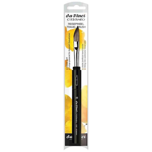 Pincel Chanfrado Sintético Da Vinci Casaneo 1597Tp Nº 10 Pincel de aquarela chanfrado feito com fibra sintética extra macia e de alta elasticidade, e cabo plástico com dupla seção desmontável para proteção das fibras e fechamento do pincel. A série TP, conhecida como Travel Brush/ Brush, é popular entre os pintores Urban Sketchers, e vem em uma embalagem transparente unitária. Técnica de Pintura: Acrílica / Aquarela Superfície de Pintura: Vidro/ Papel/ Tecido Aplicação: Pintura em Seda/ Urban Sketching Pelo/ Fibras: Fibras sintéticas Ferrolho: Ferrolho prateado Cabo: Plástico Comprimento do Cabo: Curto Família: CASANEO Formato: Chanfrado Ean: 4017505008086