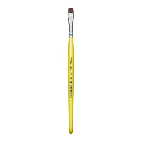 Ponta: pelo de pônei. Cabo: curto plástico amarelo. Virola: alumínio. Indicação de pintura: arte escolar artesanato. Formato: chato. Composição: pelo natural, metal e material sintético.