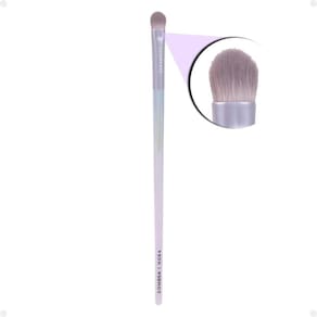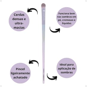 O pincel possui cerdas achatadas e firmes, que permitem uma aplicação precisa e uniforme da sombra. O formato facilita a cobertura de áreas amplas e também permite trabalhar em detalhes mais específicos, como o canto externo dos olhos e o côncavo.