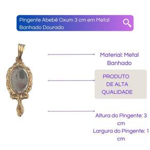Pingente Abebê Oxum em Metal - Escolha na Cor Cor: Oxum 3 cm Dourado Pingente Abebê Oxum em Metal - Escolha na Corx000D x000d O Pingente Abebê Oxum da Bialluz é de alta qualidade feitos de forma artesanal com muito carinho. É perfeito para qualquer pessoa. Cheia de boas energias e carregada de fé nosso pingente emanará muita paz em sua vidax000D x000d Escolha um dos modelos disponíveis na opção COR do próprio anúncio.x000d x000d Enviamos a seu produto em até 24 horas após a confirmação de pagamentox000D x000d Material: Zamac liga metálica x000D x000d Caso tenha alguma dúvida nos mande mensagem que respondemos rapidinho para te ajudar da melhor forma possívelx000D Marca: Não Informado