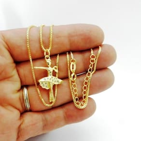Pingente Bailarina Cravejada Strás Folheado Ouro Pi230 Pingente Bailarina Cravejada Strás 17x30mm - Passante 3mm Beleza e Qualidade Sempre - Marca: Wnbijouterias - Modelo: Bailarina Cravejada Strás 17x30mm - Passante: até 3mm - Comprimento: 17x30mm - Peso: 2Gr - Acompanha Embalagem/Porta Jóia - SKU Vendedor: Pi230 Descrição Técnica: - Produto com banho super resistente. - Processo de Folheação em 3 Camadas de Ouro 18k= 750 - Não descasca, não perde a cor, qualidade garantida - Grande tempo de durabilidade. - Acompanha Embalagem/Porta Jóia - Todas as Fotos são Reais do Produto Acompanha: Certificado de - apenas para descascamento do banho da jóia - não cobre defeitos de mau uso, aranhões ou quebra de partes da jóia Contra Indicações: - Não usar creme, shampoo, perfume, protetor solar e outros cosméticos por cima da jóia. - Evitar banho de mar Devido a oxidação da água Salgada - Evitar banho de piscina Devido a oxidação do Cloro e outros produtos O que você sempre ganha em nossa loja - Qualidade Banho Super Resistente - Antialérgico Não usamos Níquel em nosso banho - Beleza e Acabamento Caimento perfeito ao usar