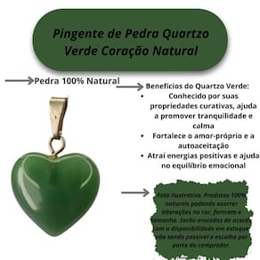 Pingente de Pedra Quartzo Verde Coração Natural Pingente de Pedra Quartzo Verde Coração Natural Adicione um toque de amor e harmonia ao seu estilo com o Pingente de Pedra Quartzo Verde Coração Natural. Feito com uma linda pedra de quartzo verde, este pingente é perfeito para quem busca não apenas beleza, mas também equilíbrio emocional e bem-estar. Benefícios do Quartzo Verde: Conhecido por suas propriedades curativas, ajuda a promover tranquilidade e calma Fortalece o amor-próprio e a autoaceitação Atraí energias positivas e ajuda no equilíbrio emocional Com um formato delicado de coração, o pingente é ideal para ser todos os dias, trazendo leveza e serenidade para o seu visual. Seja para ocasiões especiais ou para o dia a dia, esse acessório traz não só estilo, mas também as energias positivas do quartzo verde. Características: Pedra Quartzo Verde Natural Formato de coração delicado e simbólico Design atemporal e versátil Ideal para qualquer ocasião, do dia a dia a momentos especiais Sinta-se mais equilibrado e conectado com o poder do amor e da harmonia com o Pingente de Pedra Quartzo Verde Coração Natural Enviamos o seu pingente em aé 24 horas após a confirmação do pagamento Caso tenha alguma dúvida nos mande mensagem que responderemos rapidinho para te ajudar da melhor forma possível Marca: Não Informado