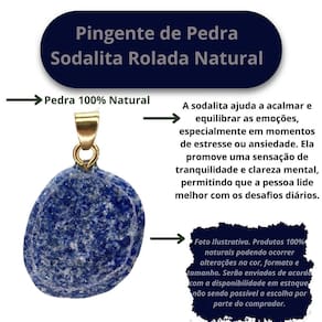 Pingente de Pedra Sodalita Rolada Natural Pingente de Pedra Sodalita Rolada Natural Todos os Cristais são de origem natural, por essa razão, apresentam variações de cor e tamanhos e por serem pedras naturais podem conter fissuras, ranhuras, veios e outros em razão do processo de extração, porém todos mantém excelente qualidade Pedra Sodalita: A sodalita ajuda a acalmar e equilibrar as emoções, especialmente em momentos de ou ansiedade. Ela promove uma sensação de tranquilidade e clareza mental, permitindo que a pessoa lide melhor com os desafios diários. A sodalita é uma pedra associada ao chakra da garganta, responsável pela comunicação. Ela ajuda a melhorar a expressão verbal, permitindo uma comunicação mais clara, assertiva e sincera, tanto em situações pessoais quanto profissionais. Enviamos o seu pedido em até 24horas após a confirmação do pagamento Caso tenha alguma dúvida nos mande mensagem que responderemos rapidinho para te ajuda da melhor forma possível Marca: Meta Atacado