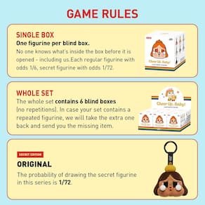 POP MART Crybaby Cheer UP, Baby! Série Caixa cega com pingente de pelúcia, 6 peças de bonecos cegos de bebê chorão, bonecos de ação de design aleatório, brinquedos colecionáveis, decorações de casa, - POP MART CRYBABY CHEER UP, BABY! SÉRIE - Caixa cega com pingente de pelúcia: A caixa cega contém uma figura aleatória de uma série específica. Cada caixa persiana contém apenas um boneco. Ninguém, incluindo nós, sabe o que está dentro. Esta coleção contém 6 figuras de caixa-surpresa, uma delas pode ser a edição secreta. - Design aleatório: as caixas cegas são totalmente aleatórias e não podemos aceitar solicitações de itens específicos. As chances de obter a edição secreta geralmente são de 1/72. Ao comprar o conjunto completo, não haverá figuras duplicadas. - Escolha de presente ideal: Estes bonecos são o presente perfeito para qualquer ocasião, seja Dia das Crianças, Natal, Halloween, Ação de Graças ou Ano Novo. Uma obra de arte que expressa sentimentos profundos e emoções complicadas, também é um presente maravilhoso de decoração de casa para sua família ou amigos. - Materiais e segurança: com 11 cm de altura, cada boneco é feito de materiais premium, incluindo 100% fibra de poliéster e papel. Finalizados com tinta não tóxica e inodora, nossos brinquedos atendem a rigorosos padrões de segurança para garantir a segurança dos clientes. - Atendimento ao cliente: se você receber um item danificado ou encontrar problemas de qualidade, consulte as informações de contato na página de detalhes do produto ou escaneie o código QR na página inicial da loja na seção "Ajuda". Estamos comprometidos em garantir uma experiência satisfatória ao cliente.