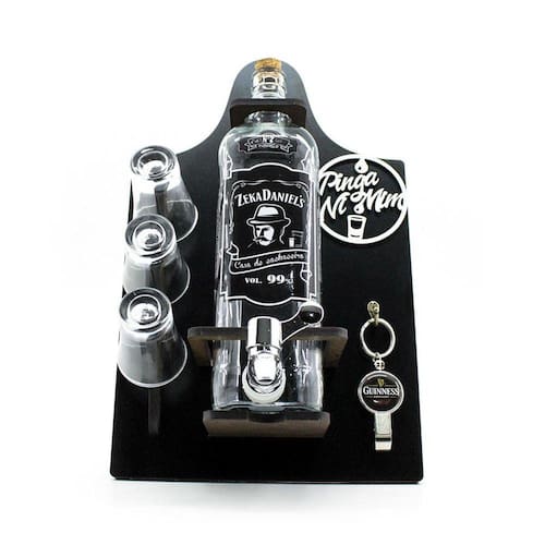 Pingômetro de Parede Garrafa Zeka Daniels c/3 Copos Um Pingômetro super descolado para enfeitar aquela área de reunião da galera para tomar aqueles shots e curtir um bom papo Ele é fabricado em MDF, com recorte a laser. Informações: Garrafa de vidro que comporta até 01 Litro Torneira automática cromada 3 Copos dose 60ml de vidro.