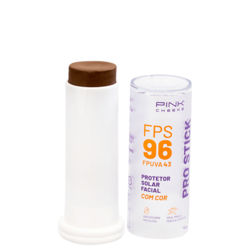 Protetor solar com cor. Pink Cheeks Pro Stick FPS96 possui alta cobertura, uniformiza o tom, hidrata e garante proteção FPS96 e FPUVA 43 para a sua pele.