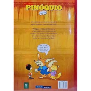 RESUMO Pinóquio em Quadrinhos traz à vida a história do boneco que deseja ser humano por meio de quadros ilustrados repletos de cor e dinamismo. A simplicidade da narrativa combinada com imagens expressivas promove conexão e compreensão em leitores iniciantes. Uma versão encantadora que estimula a curiosidade, valoriza a imaginação e celebra valores como honestidade, sonho e transformação. Ideal para primeiros leitores e para ambientes educativos que valorizam o lúdico.