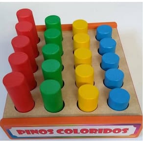 Caixa de Madeira com 20 pinos coloridos nas cores básicas Formato arredondado, excelente acabamento, tinta atóxica Brinquedo educativo que estimula o aprendizado das cores e formas. Tamanho e Cores