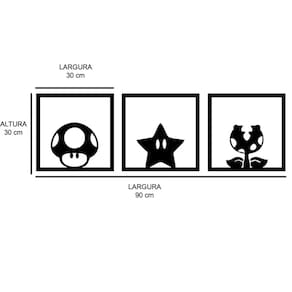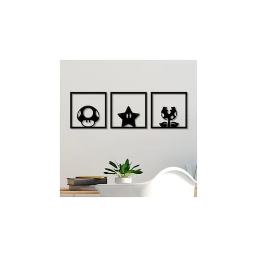 Sua compra incluye:Tres cuadros con figuras Mundo Mario Bross para la decoración de cualquier espacio en tu hogaratura30cmMancho 30cmColor: NegroViene con cinta Adhesiva para ser colgado diretamente a la pared (se recomienda que la superficie est limpia) Envios a todo Chile)