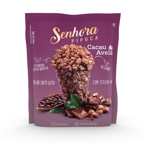 Pipoca Cacau & Avelã 90G 12g de whey isolado; Biomassa de banana; Estourada no ar quente sem óleo ; Zero glúten; Zero lactose; Milho de pipoca integral não transgênico,glucose de milho, água, isomalte, biomassa de banana verde, cacau 100%,whey protein isolado, bicarbonato de sódio , cremor de tártaro e dulcorante natural de glicosídeos de steviol. Não contém glúten. Alérgicos: pode conter derivado de amendoim.