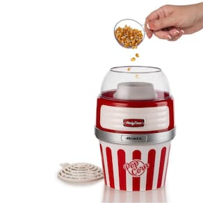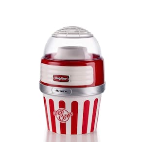 Pipoqueira elétrica Ariete Retrô Party Time com potência de 1100W, capacidade para 60g de milho, sistema de ar quente e tigela removível.