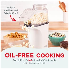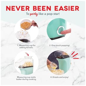 Faça pipoca fresca e quentinha em minutos com a pipoqueira Fresh Pop da DASH. Sem necessidade de óleo, a câmara de aquecimento de alta capacidade desta pipoqueira produz até 16 copos de deliciosa pipoca usando apenas ar quente. Mais saudável do que usar o fogão ou micro-ondas, a pipoqueira DASH Fresh Pop é a maneira natural de desfrutar da sua pipoca sem aditivos. Com 1400 watts de potência, nenhum grão de milho ficará para trás. Perfeita para criar um lanche único para festas ou simplesmente desfrutar de uma noite relaxante de cinema, esta máquina de fazer pipoca com ar quente faz tudo. Utilize a bandeja para derreter a manteiga para um sabor deliciosamente amanteigado sem aromatizantes artificiais ou conservantes. O canal de pipocas e a bandeja para manteiga são seguros para a máquina de lavar louça para uma limpeza fácil. RÁPIDA E FÁCIL: Basta medir e adicionar os grãos de milho de pipoca na câmara de aquecimento de alta capacidade, e em seguida pressionar o botão de início para ter pipoca quente e fresca em minutos. É tão fácil que até as crianças podem fazer. MAIS SAUDÁVEL: A Pipoqueira DASH utiliza ar quente, sem óleo ou conservantes adicionados de sacos de micro-ondas, para estourar 16 copos de pipoca quente e fresca de forma rápida e eficiente. Perfeita para festas, reuniões em grupo ou uma noite tranquila em casa. MULTIFUNCIONAL: O copo medidor incluído também serve como bandeja para derreter a manteiga no topo da máquina, basta adicionar uma colher de manteiga enquanto a pipoca estoura e despejar uma vez derretida para uma pipoca com sabor de cinema. COMPACTA: A Pipoqueira DASH é um item essencial para seu primeiro apartamento, cozinha pequena, vida em dormitório universitário ou viagens de trailer. Além disso, seu design elegante e opções de cores modernas vão combinar com qualquer espaço de cozinha, tornando-a um presente perfeito. INCLUI: A Pipoqueira DASH de 16 copos inclui um copo medidor para grãos de pipoca e manteiga derretida, e um livro de receitas.