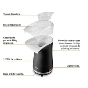 Características Gerais do produto Não usa oleo\nPrepara rapidametrosente pipoca semetros necessidade de óleo\nPrática e fácil de metrosanusear\nBocal direcionador para a pipoca\nDosador para pipoca\nChave liga/desliga\nPés antiderrapantes