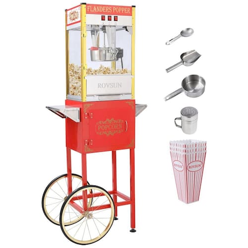 Pipoqueira Elétrica Estilo Cinema com Rodas e Chaleira de 236g Rende até 7L de Pipoca Inclui Colher de Pipoca e Colher de Óleo, 850W, ROVSUN, Vermelha - 110V