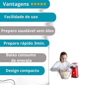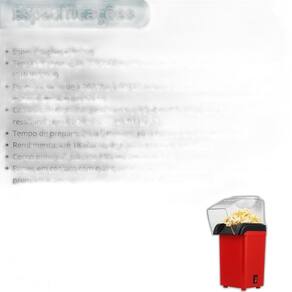 Pipoqueira elétrica compacta, sem óleo, com tecnologia de ar quente (hot air). Prepara pipoca em aproximadamente 3 minutos. Possui tampa dosadora multifuncional.Luz indicadora de funcionamento