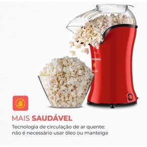 Pipoqueira elétrica Mondial Red, 1200W, prepara pipoca em menos de 3 minutos com ar quente, sem óleo. Possui bocal direcionador, tampa dosadora, sistema de proteção contra superaquecimento e porta-fio.Preparação