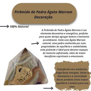 Pirâmide de Pedra Ágata Marrom Decoração Pirâmide de Pedra Ágata Marrom Decoração A Pirâmide de Pedra Ágata Marrom é um elemento decorativo e energético, perfeito para quem deseja agregar beleza e harmonia ao ambiente. Feita com Ágata Marrom natural, uma pedra conhecida por suas propriedades de equilíbrio e estabilidade, esta pirâmide é ideal para decorar espaços de maneira sofisticada, além de trazer benefícios espirituais e emocionais. A Ágata Marrom, com suas cores terrosas e padrões únicos, transmite uma sensação de acolhimento e conexão com a terra, favorecendo a paz interior e a proteção. A forma piramidal potencializa as energias da pedra, criando uma atmosfera de harmonia e fortalecendo a energia do ambiente. Benefícios: Equilíbrio e Estabilidade: A Ágata Marrom é uma pedra que promove estabilidade emocional, ajudando a equilibrar as energias do ambiente e proporcionando um estado de tranquilidade e serenidade. Proteção Energética: A pirâmide de Ágata Marrom atua como um poderoso protetor de energias negativas, criando uma barreira que filtra vibrações indesejadas e promove um ambiente mais seguro e harmonioso. Atenuação de Ansiedade e : Ideal para quem busca um auxílio contra ansiedade, o ou tensões emocionais, essa pedra ajuda a aliviar esses sentimentos, promovendo um estado mental mais calmo e focado. Decoração Sofisticada: Além de suas propriedades espirituais, a pirâmide de Ágata Marrom é uma peça decorativa elegante e atemporal, que combina com diversos estilos de interiores, desde os mais modernos até os mais tradicionais. Apoio ao Crescimento Pessoal: A pirâmide também pode auxiliar na superação de obstáculos e no desenvolvimento de uma maior autoestima, trazendo uma energia que incentiva o autoconhecimento e a evolução pessoal. Esta pirâmide de Ágata Marrom é um excelente item tanto para quem busca benefícios energéticos quanto para quem deseja embelezar seu espaço com um toque de elegância e espiritualidade. Ideal para escritórios, salas de meditação, quartos ou qualquer ambiente onde a paz e o equilíbrio sejam desejados. Enviamos a sua peça em até 24 horas após a confirmação do pagamento Caso tenha alguma dúvida nos mande mensagem que responderemos rapidinho para te ajudar Marca: Não Informado Ean: 7894135851537