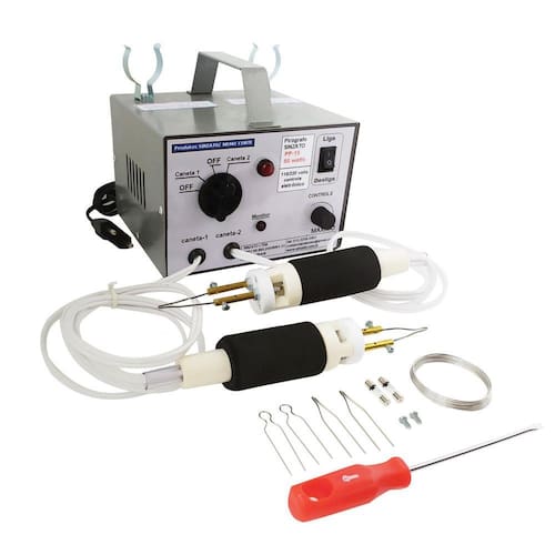 Temperaturas: Ajuste por Controle Eletrônico, que possibilita mais de 100 níveis de temperatura, de 50 a 850 graus. Montado em caixa metálica, com alça de transporte e suportes para as canetas no topo. Garantia de balcão de 01 ano para defeitos de fabricação.