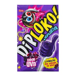 PIRULITO DIP LOKO EXPLOSIVE SABOR UVA O pirulito que explode na sua boca! Possui Mini Balinhas em Pó que explodem na boca, são vários sabores que irão fazer uma verdadeira explosão de alegria. Alérgic