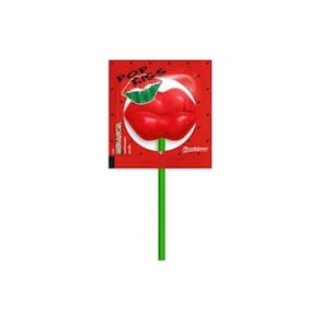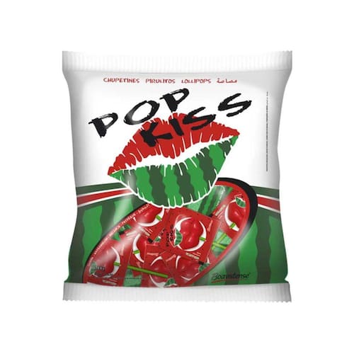 Pacote contendo 50 unidades de pirulito Pop Kiss sabor Melancia, embalados individualmente, com 10 gramas cada. Peso total da embalagem 500 gramas.