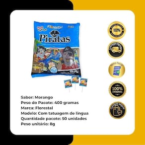 Contém: 1 pacote de 400 g de pirulitos Pirata pop que tatuam temporariamente a língua com um desenho . Pirulito sabor morango, colorido e aromatizado artificialmente. Pirulito com tatuagem de língua Pirata O pirulito tatoo é uma nova sensação: ele é capaz de tatuar temporariamente a língua com uma figura. Para conseguir o melhor efeito, pressione o pirulito por um tempo sobre a língua, sem mover. Ótimo para distribuir a crianças no final da festa, pois irão se divertir muito As estampas são e temáticas de acordo com o pacote. A Festa de todo mundo fica muito mais doce com guloseimas, docinhos e pirulitos. Adoce sua festa com doces para criançada. Com certeza será uma sensação entre as crianças e também entre os adultos Experiência Divertida: Destaque o diferencial do pirulito com tatuagens de língua, proporcionando uma experiência interativa e divertida que encanta crianças e provoca sorrisos. Sabor Incrível: Informe sobre os sabores deliciosos que acompanham cada pirulito, garantindo que a diversão venha com um gosto irresistível que todos adoram. Ideal para Eventos Temáticos: Enfatize que esses pirulitos são perfeitos para festas de aniversário, especialmente com o tema de princesas, adicionando um toque especial e único à celebração. Formato Atrativo: Atraia a atenção para o design charmoso e colorido dos pirulitos, que não só são gostosos, mas também atraem visualmente, tornando-os irresistíveis para os pequenos. Marca: Não Informado Ean: 7794670571351