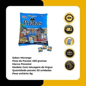 Contém: 1 pacote de 400 g de pirulitos Pirata pop que tatuam temporariamente a língua com um desenho . Pirulito sabor morango, colorido e aromatizado artificialmente. Pirulito com tatuagem de língua Pirata O pirulito tatoo é uma nova sensação: ele é capaz de tatuar temporariamente a língua com uma figura. Para conseguir o melhor efeito, pressione o pirulito por um tempo sobre a língua, sem mover. Ótimo para distribuir a crianças no final da festa, pois irão se divertir muito As estampas são e temáticas de acordo com o pacote. A Festa de todo mundo fica muito mais doce com guloseimas, docinhos e pirulitos. Adoce sua festa com doces para criançada. Com certeza será uma sensação entre as crianças e também entre os adultos Experiência Divertida: Destaque o diferencial do pirulito com tatuagens de língua, proporcionando uma experiência interativa e divertida que encanta crianças e provoca sorrisos. Sabor Incrível: Informe sobre os sabores deliciosos que acompanham cada pirulito, garantindo que a diversão venha com um gosto irresistível que todos adoram. Ideal para Eventos Temáticos: Enfatize que esses pirulitos são perfeitos para festas de aniversário, especialmente com o tema de princesas, adicionando um toque especial e único à celebração. Formato Atrativo: Atraia a atenção para o design charmoso e colorido dos pirulitos, que não só são gostosos, mas também atraem visualmente, tornando-os irresistíveis para os pequenos. Marca: Não Informado Ean: 7794670571351