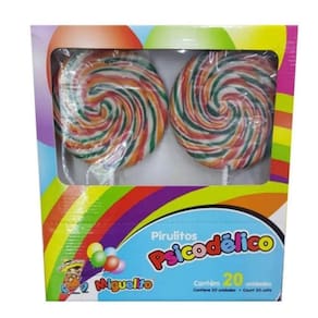 Caixa contendo 20 unidades de Pirulito Psicodélico Grande (Diâmetro 12 cm) com 150 gramas cada. Peso total embalagem 3kg.