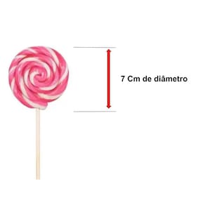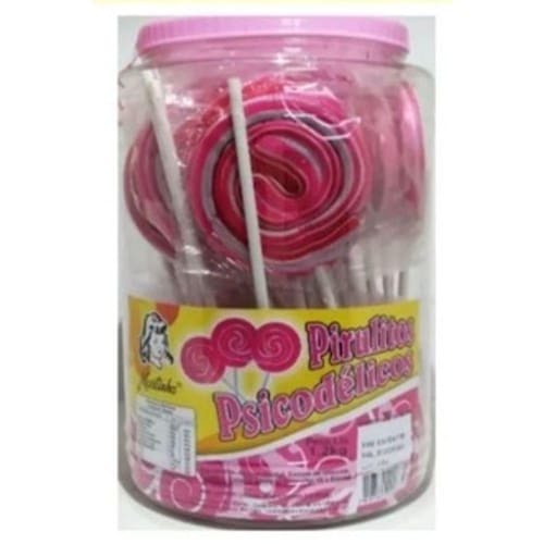 Pote contendo 30 unidades de pirulito Psicodélico nas cores Rosa e Branco, embalados individualmente, com 40 gramas cada. Cada pirulito tem aproximadamente 7 centímetros de diâmetro. Peso total da embalagem 1,2Kg.