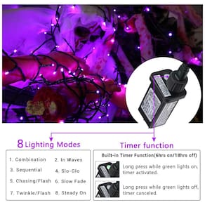 8 modos de iluminação e temporizador automático: estas luzes laranja e roxas de Halloween apresentam 8 modos de iluminação, basta pressionar o botão no adaptador para configurar seu show de iluminação favorito. O temporizador integrado manterá as luzes de Halloween ligadas por 6 horas e desligadas por 18 horas uma vez ativadas. Liberte as mãos e economize energia. Nota: Pressione o botão por 3 segundos até que uma luz verde acenda, o cronômetro será ativado